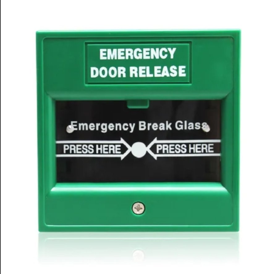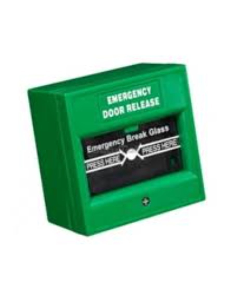 8déclencheur manuel d’urgence (Emergency Door Release) de couleur verte, utilisé pour déverrouiller immédiatement les portes sécurisées électroniquement en cas d’urgence.