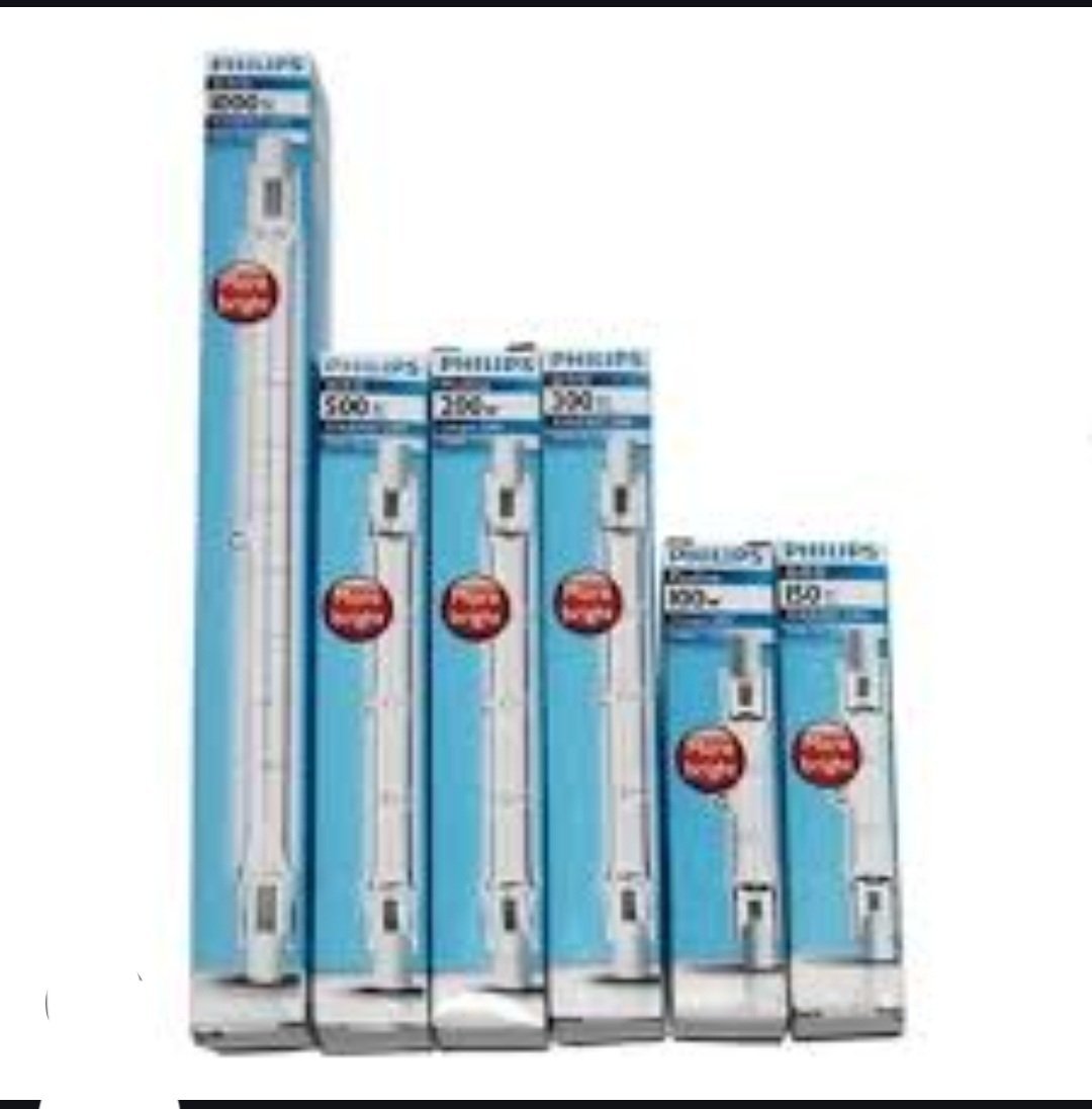 lampe halogène linéaire Philips Plusline Large 1500W R7s. Cette ampoule est conçue pour fournir un flux lumineux maximal, idéal pour éclairer de vastes zones telles que les espaces extérieurs, les bâtiments et les magasins.