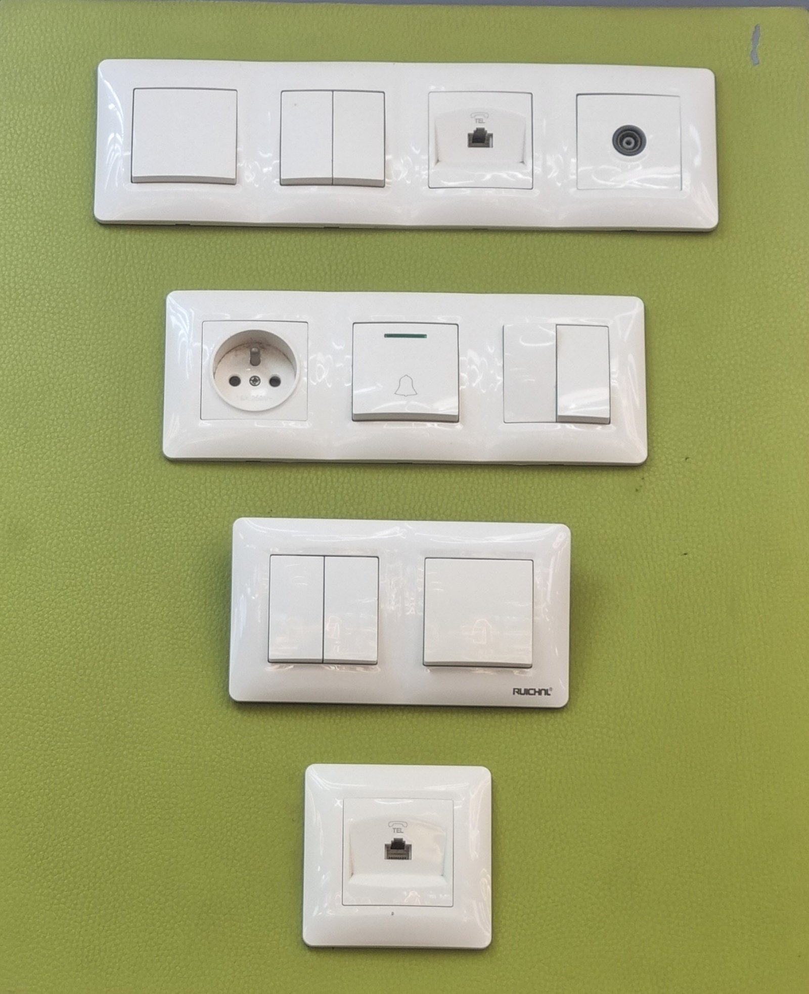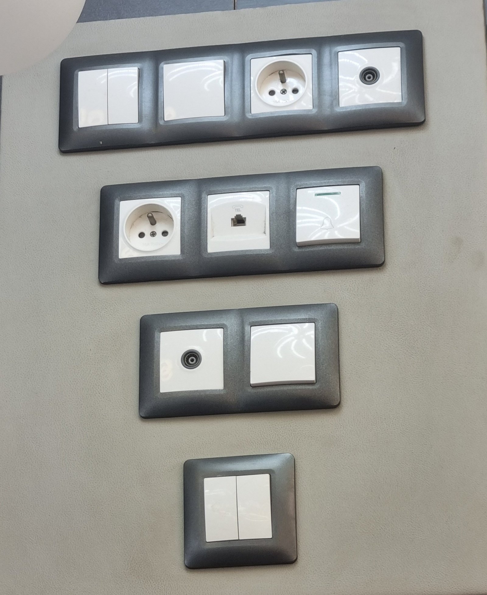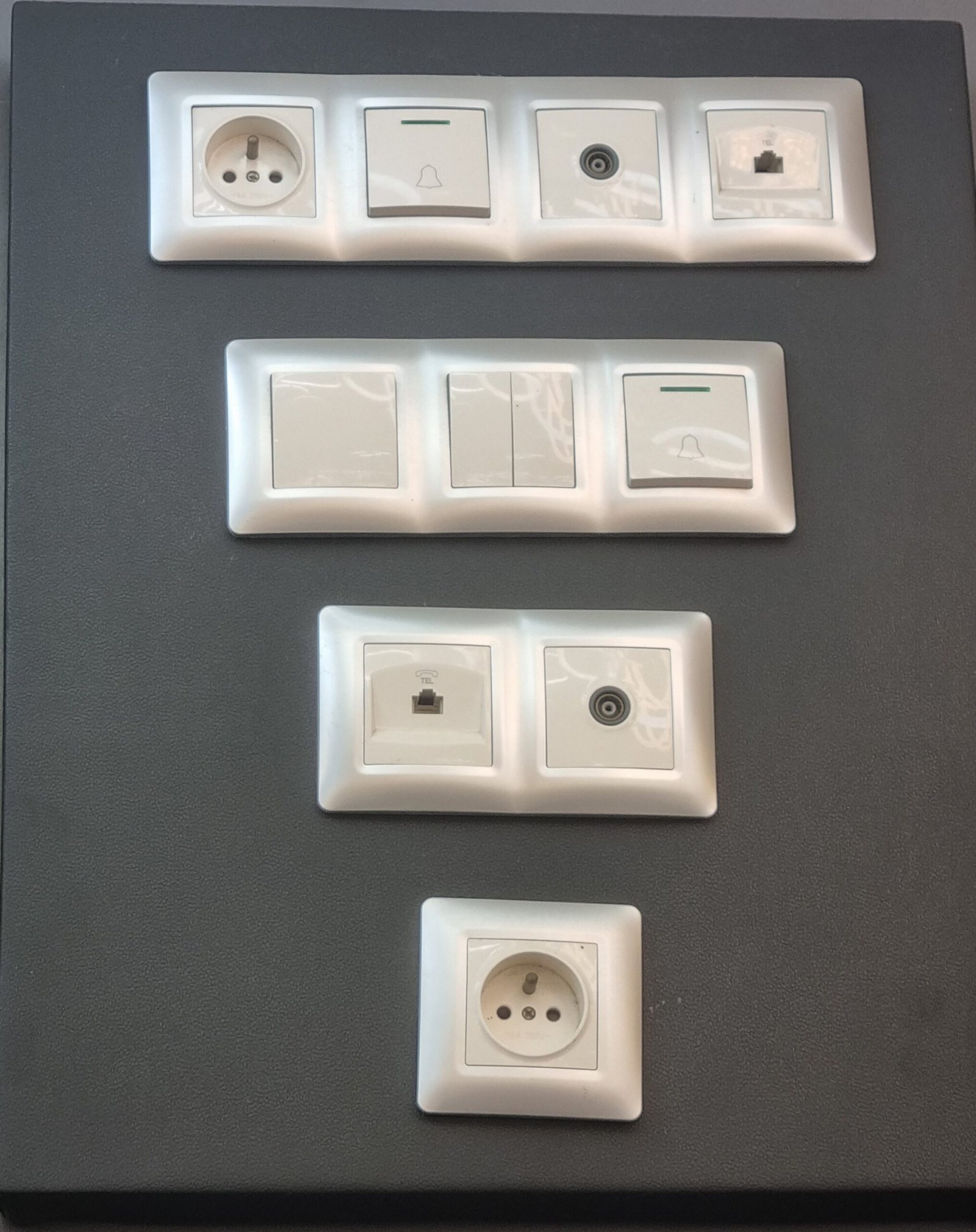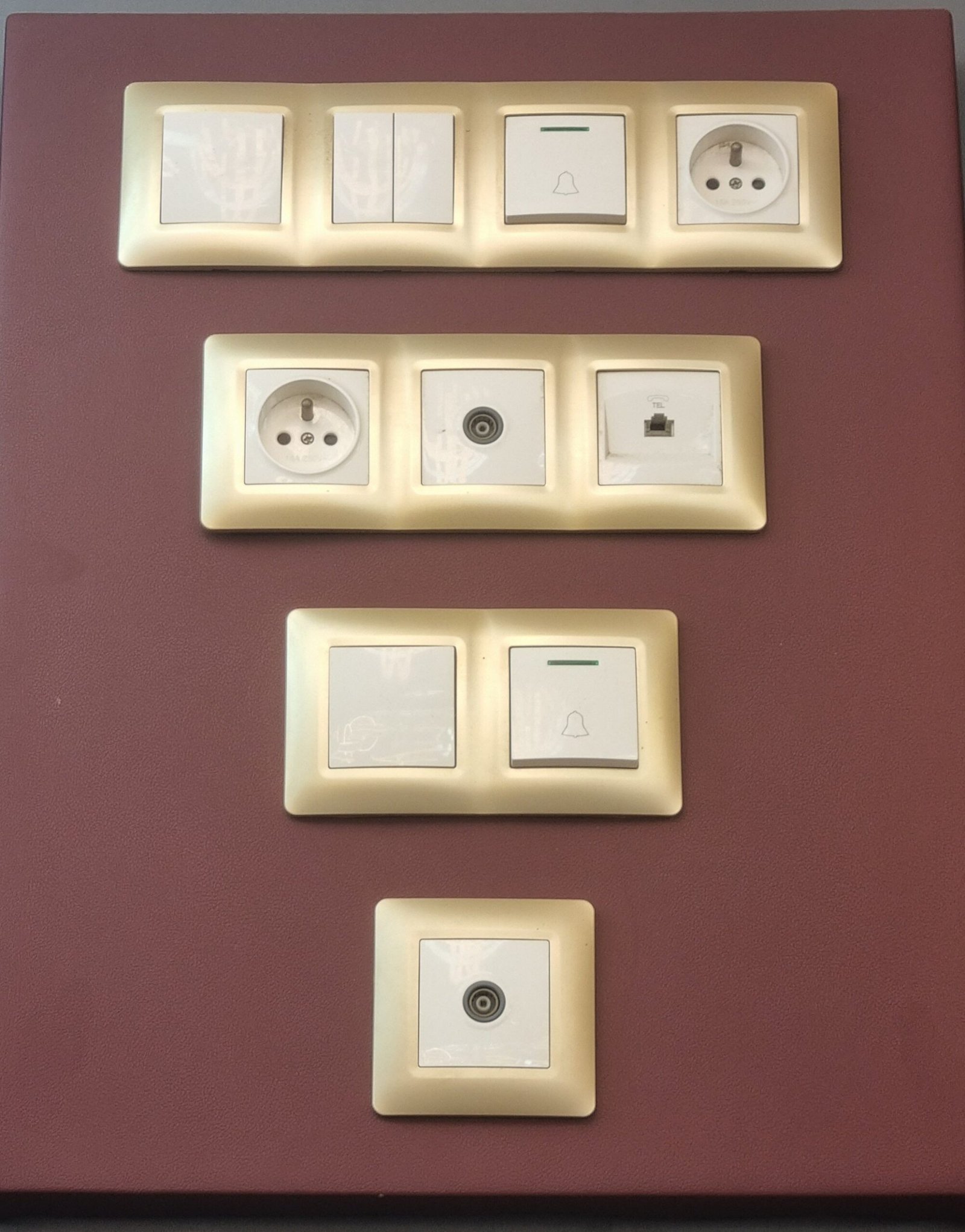 En haut : Une prise de courant de type Schuko (type F), couramment utilisée en Allemagne, en Finlande et dans d’autres pays. Elle est accompagnée d’interrupteurs ou de boutons-poussoirs.Deuxième module :