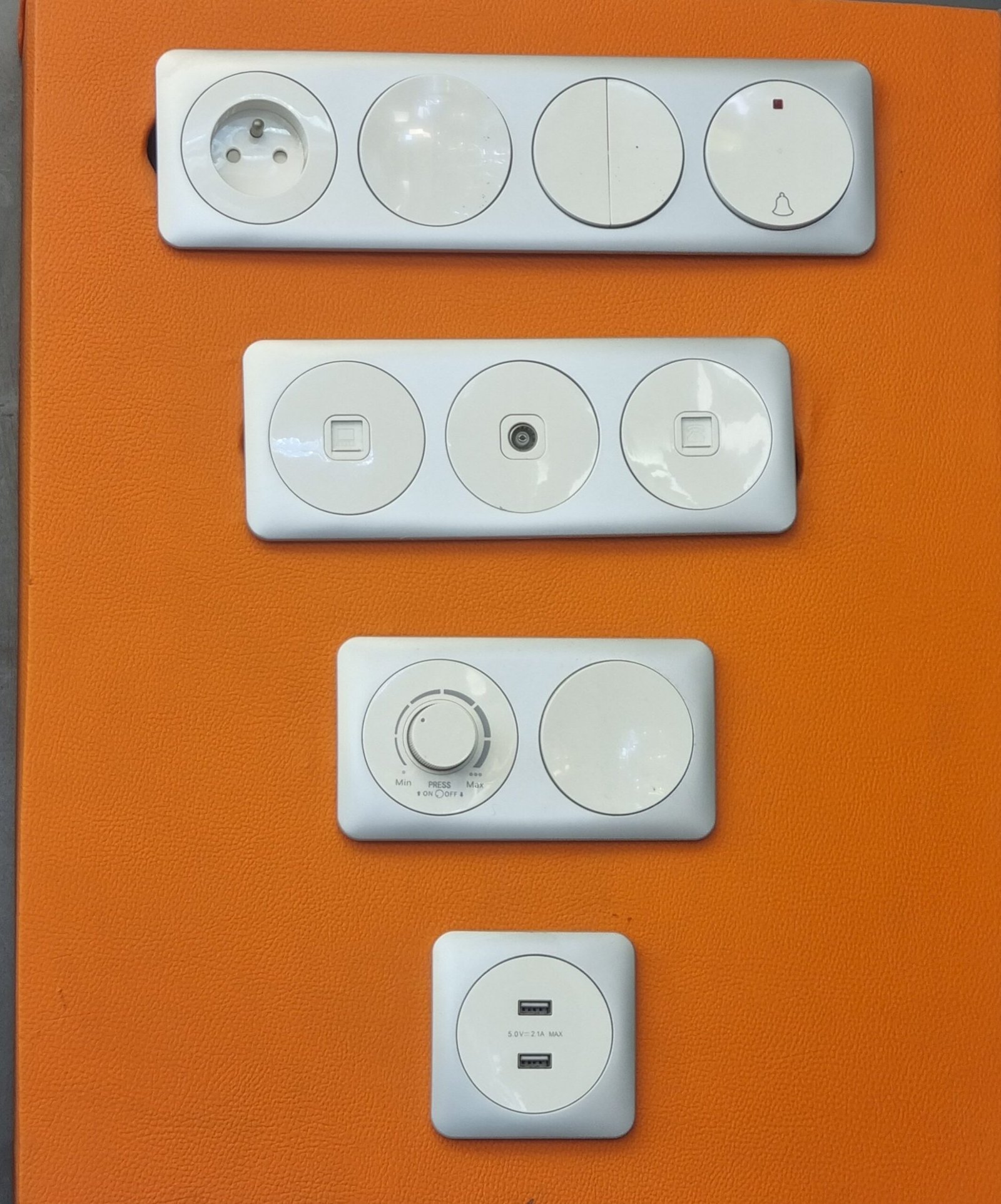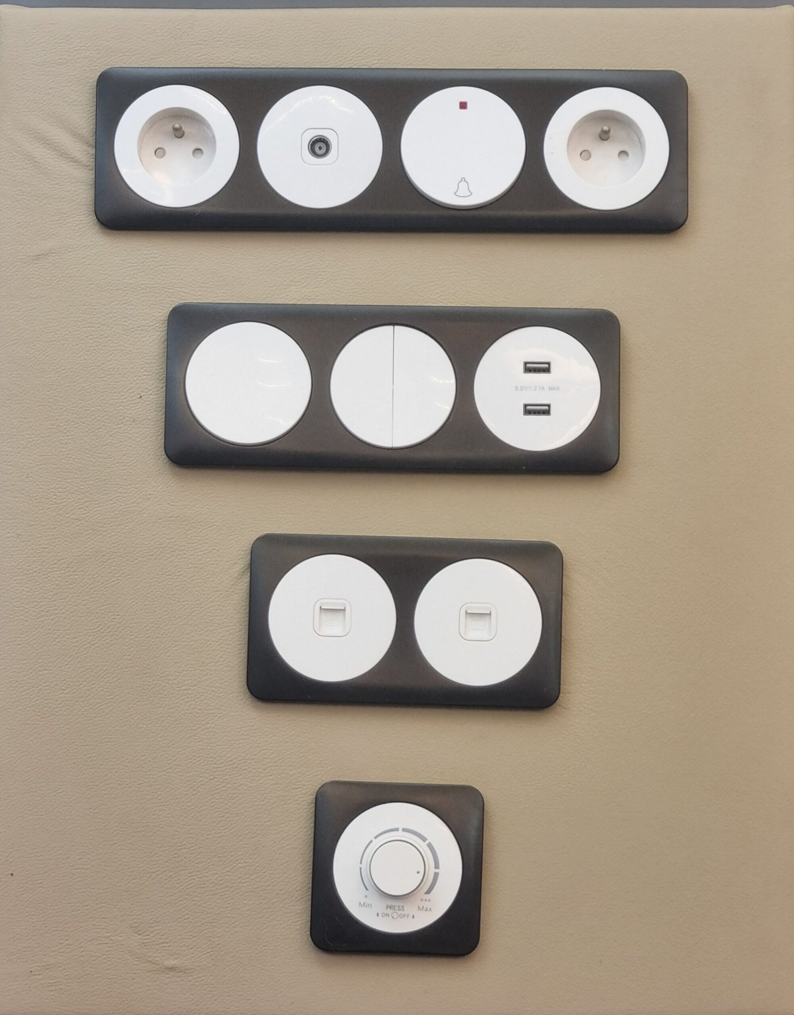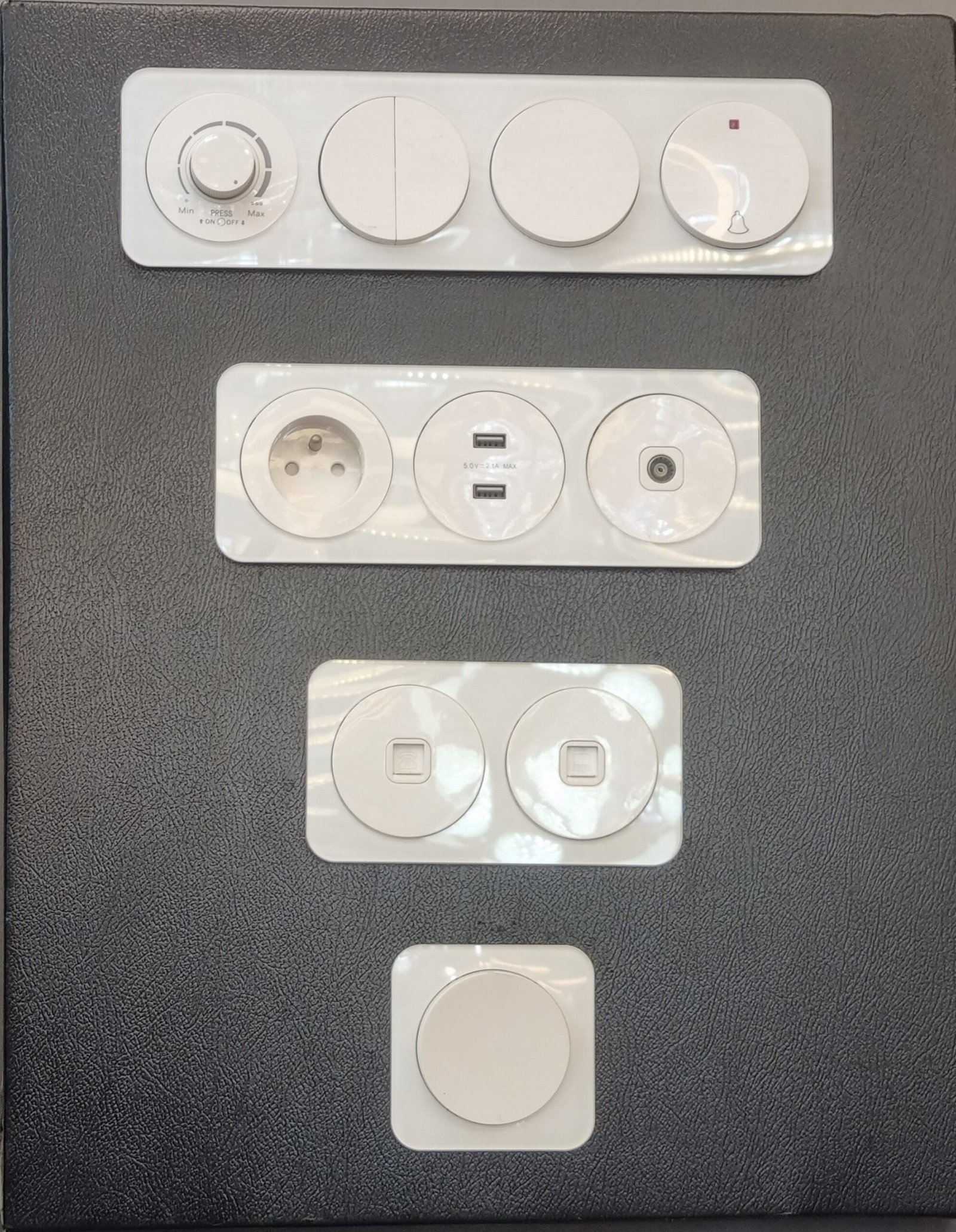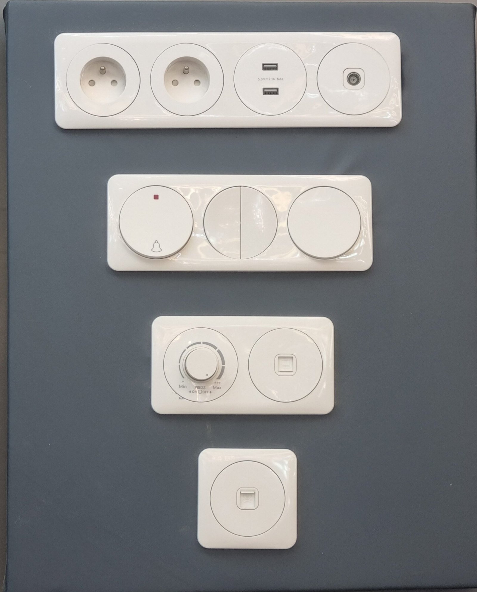 Troisième module : Comprend un variateur de lumière (avec le bouton rotatif “Min” / “Max”) et un interrupteur standard.En bas :