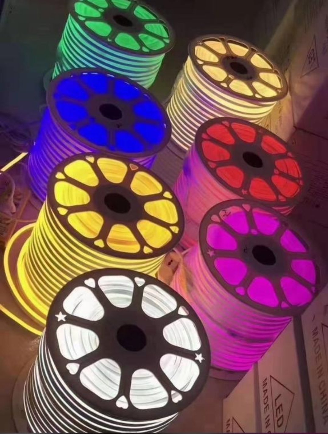 Rubans néon LED flexibles, souvent appelés “Neon Flex”, enroulés sur des bobines pour l’installation. Ces produits sont polyvalents pour l’éclairage décoratif et les enseignes.