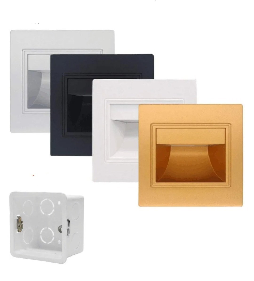 Type d’éclairage : LED.Installation : Encastrée, nécessitant l’utilisation d’un boîtier de montage spécifique, comme celui montré en bas à gauche (souvent de type 86).