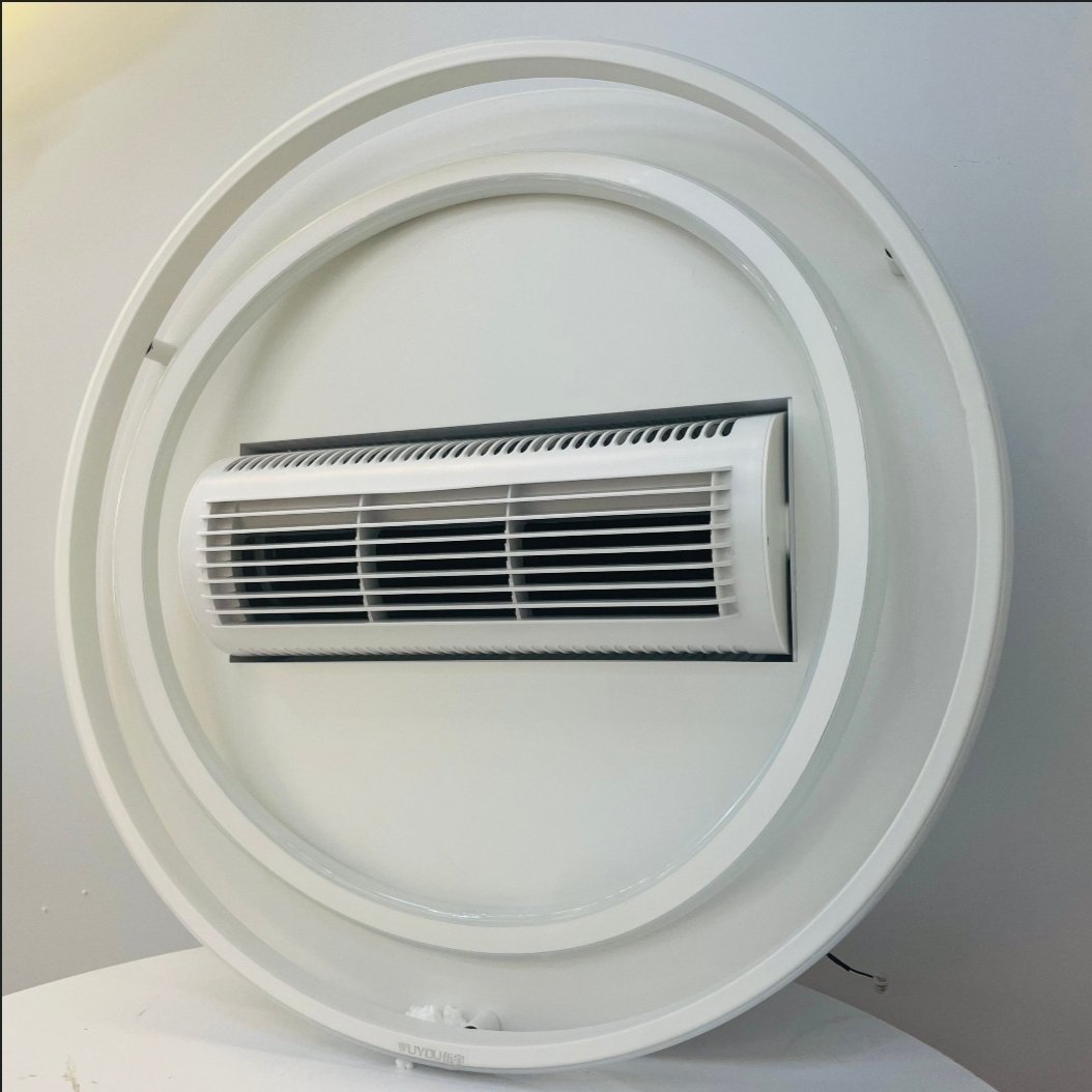 bouche de ventilation, probablement une bouche de VMC (Ventilation Mécanique Contrôlée) ou un aérateur de plafond. Ce type de dispositif a pour fonction d’extraire l’air vicié des pièces pour le rejeter à l’extérieur, assurant ainsi un renouvellement constant de l’air intérieur.