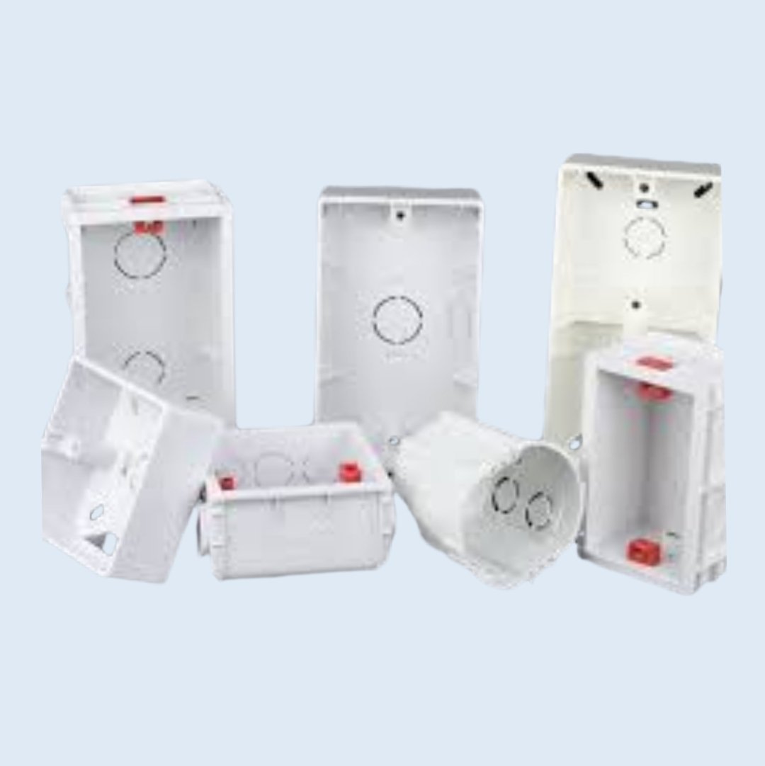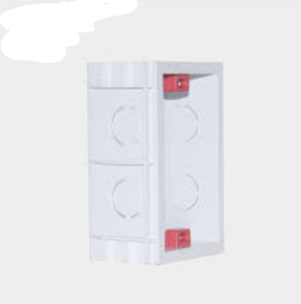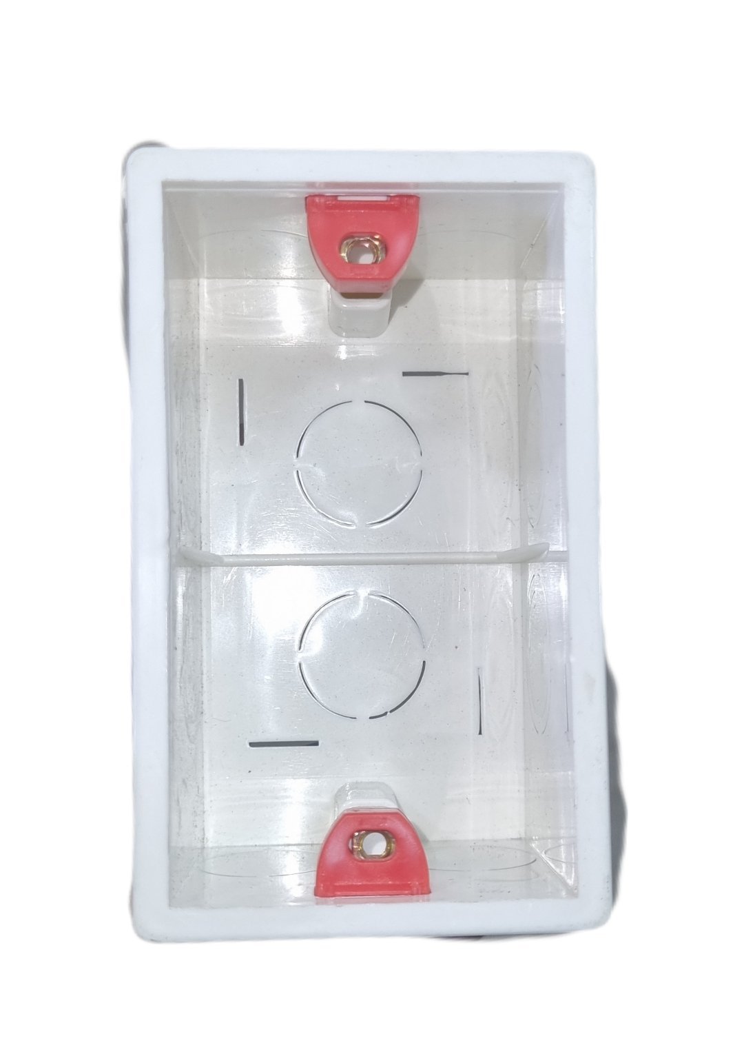 Boîte d’encastrement (ou boîte de jonction) électrique, généralement en PVC blanc, conçue pour être installée dans les cloisons ou les murs pleins. Ses clips rouges (ou crochets) servent à la fixation dans les murs creux, comme les plaques de plâtre.