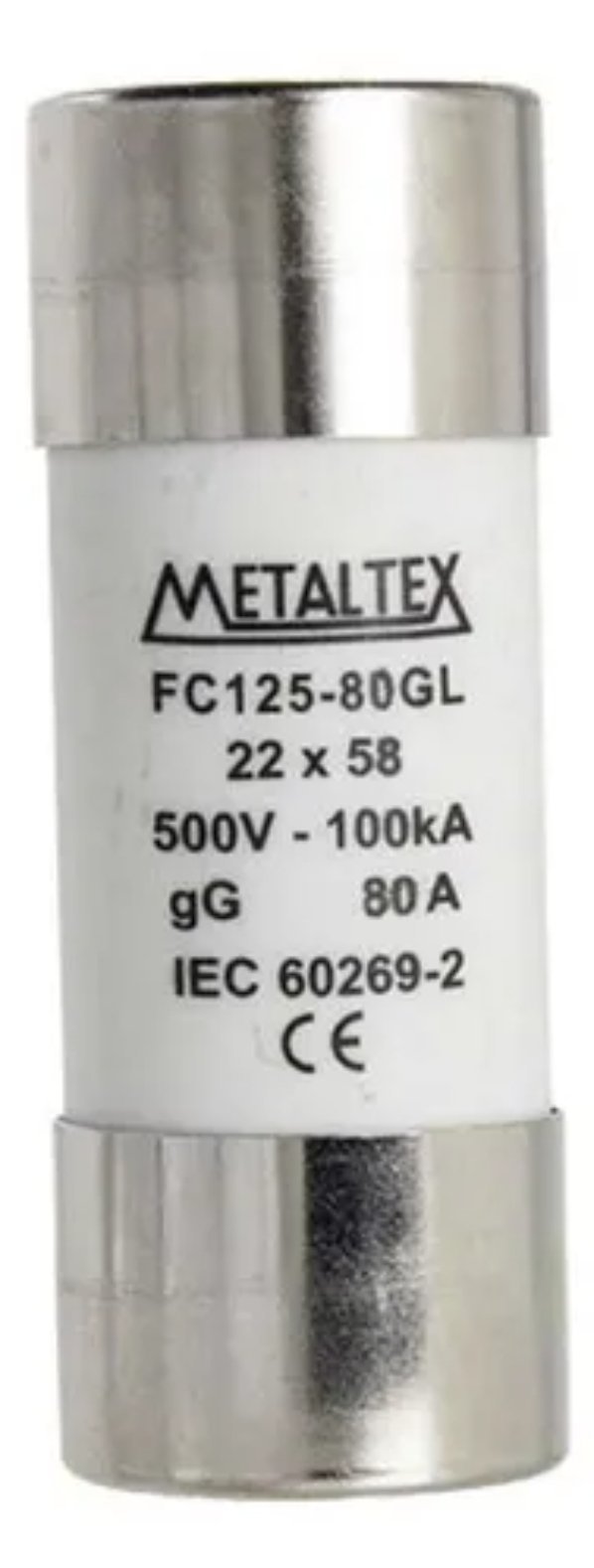 fusible cylindrique industriel de type gG, fabriqué par la marque Metaltex, modèle FC125-80GL.