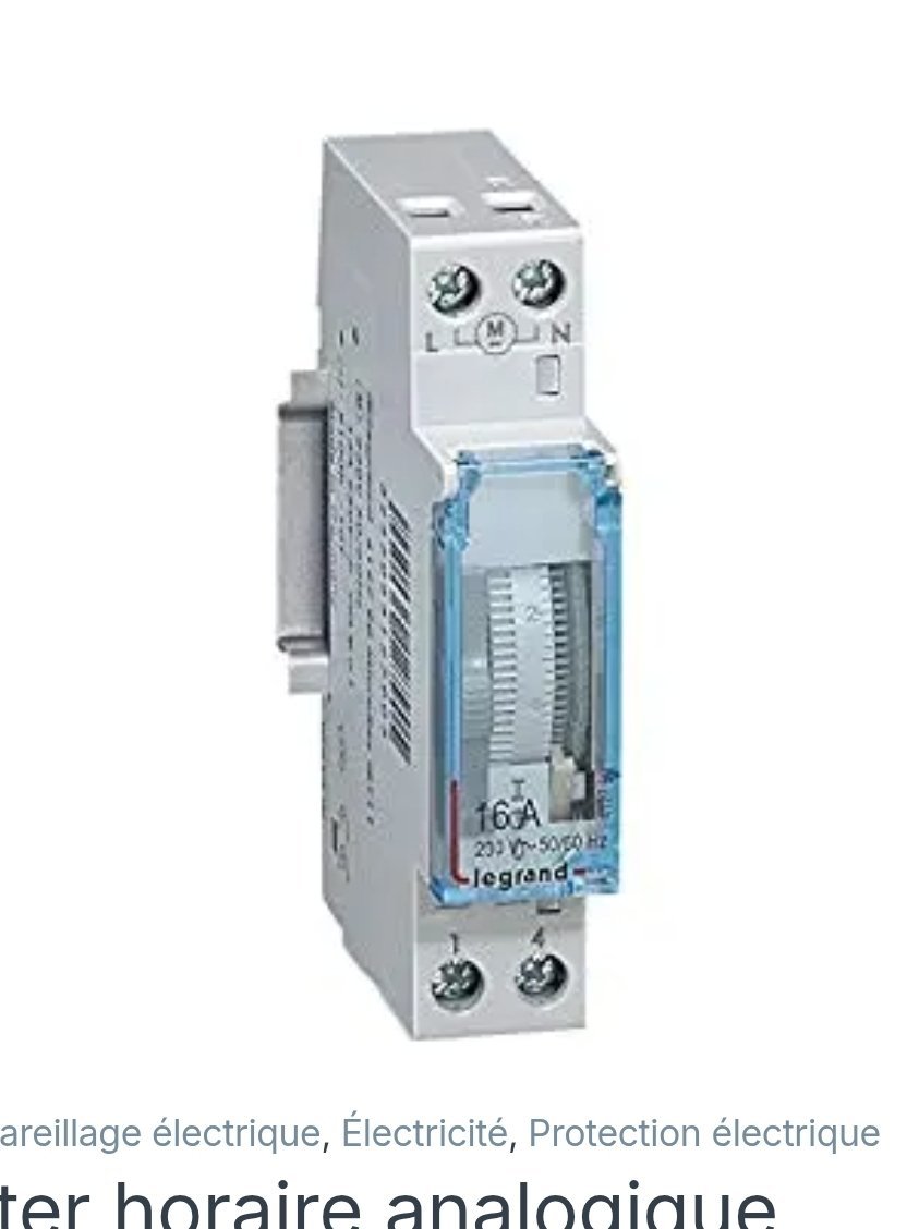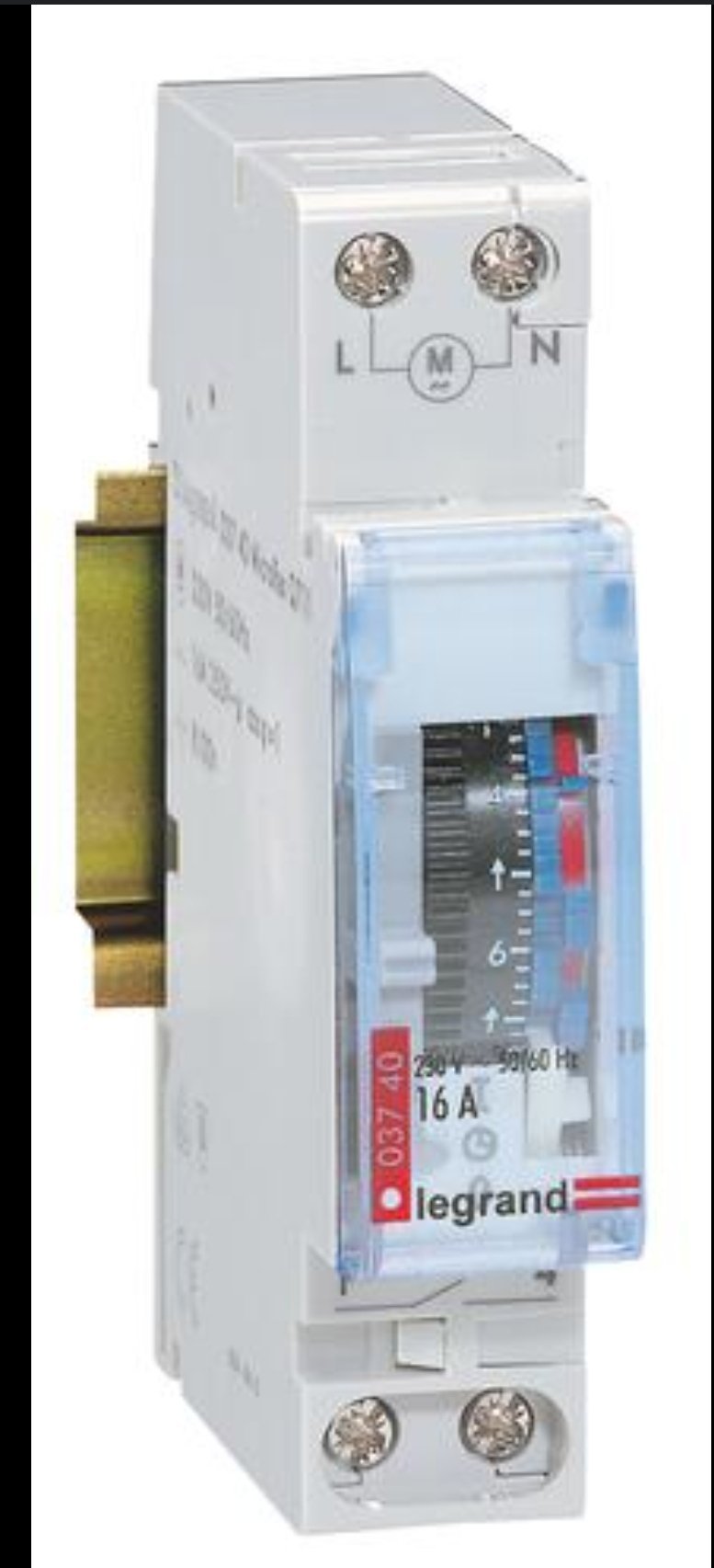 Interrupteur horaire hebdomadaire programmable analogique de marque Legrand. Il assure la mise en marche et l’arrêt d’un circuit électrique à des horaires choisis pendant un espace temps programmé à l’avance.