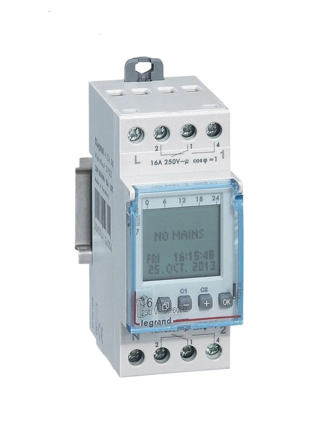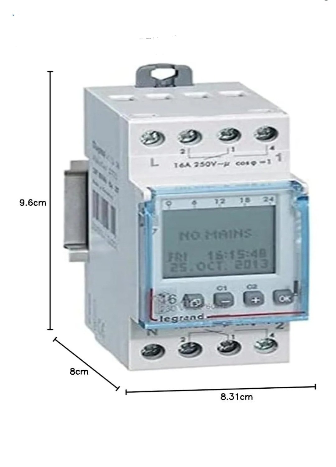 MINUTERIE : Programmation quotidienne ou hebdomadaire. Menu déroulant disponible en 15 langues.Programmateur numérique : jusqu’à 56 possibilités de programmation.Interrupteur horaire numérique multifonction : 1 sortie, 230 V, avec réserve de marche.Minuterie : Gérez l’allumage et l’extinction de vos installations sans avoir à être présent ni à interagir avec le circuit.Planning hebdomadaire : autonomie de fonctionnement de l’horloge : 5 ans