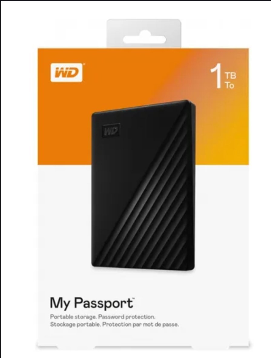disque dur externe WD My Passport d’une capacité de 1 To. Ce modèle offre une solution de stockage portable, compacte et fiable, avec des fonctionnalités de protection par mot de passe et de sauvegarde automatique.