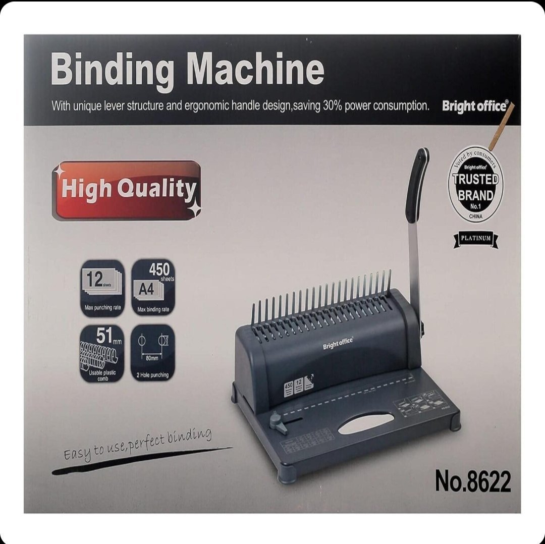 machine à relier de marque Bright Office, modèle No. 8621. Il s’agit d’un appareil de bureau utilisé pour perforer des documents et les assembler avec des anneaux en plastique pour créer un livret ou un rapport.