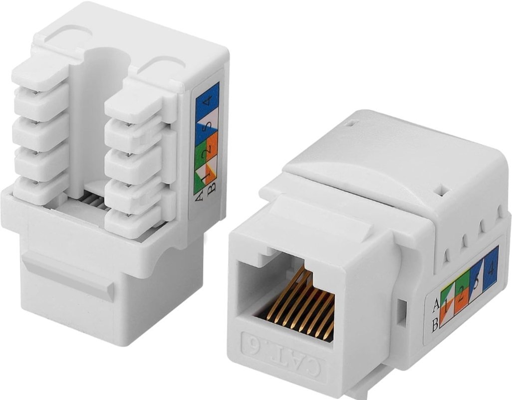module de prise murale RJ45, également connu sous le nom de connecteur Ethernet ou 8P8C. Ce type de module est utilisé pour terminer un câble réseau dans une prise murale, offrant une solution organisée pour connecter des appareils à un réseau local.