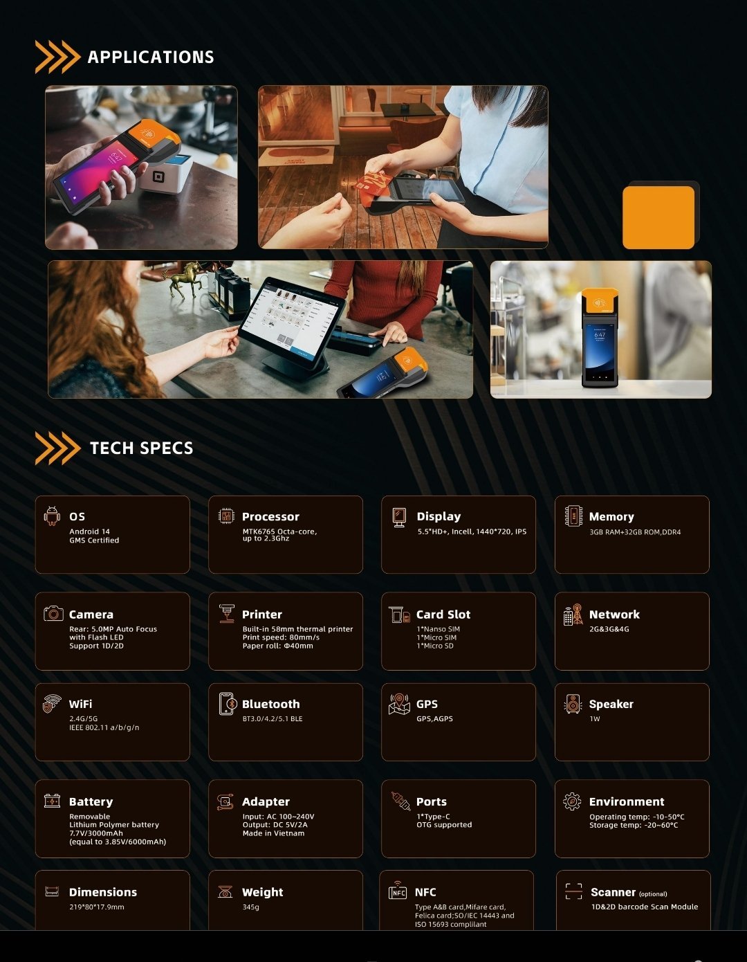 Cet appareil est utilisé dans le commerce de détail, la logistique, la gestion d’inventaire et les systèmes de paiement pour accepter diverses méthodes de paiement et imprimer des reçus.