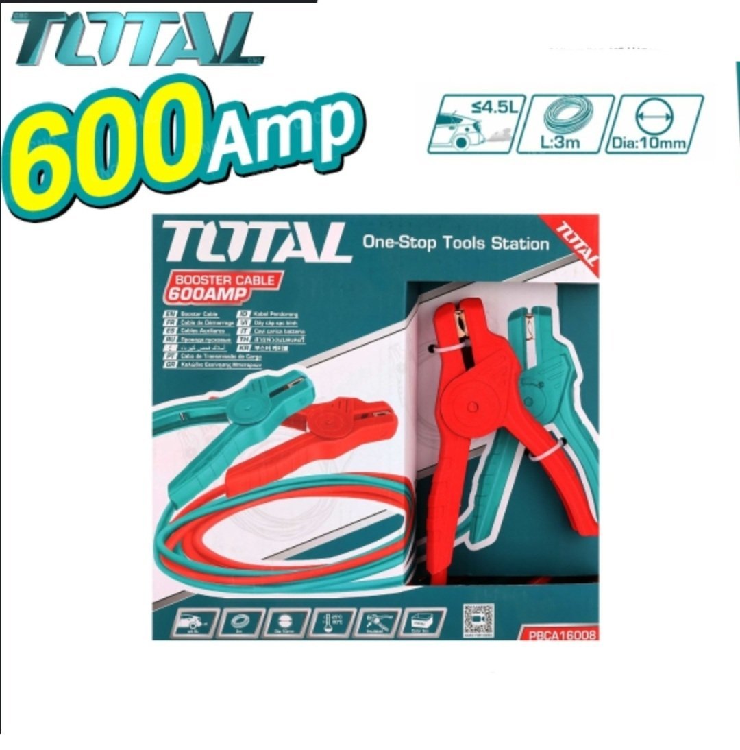 câbles de démarrage de la marque TOTAL. Ces câbles sont utilisés pour démarrer un véhicule dont la batterie est déchargée en le connectant à la batterie d’un autre véhicule.