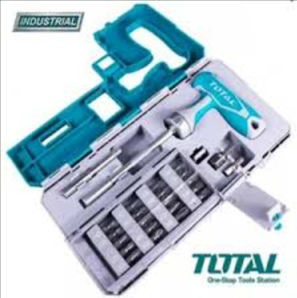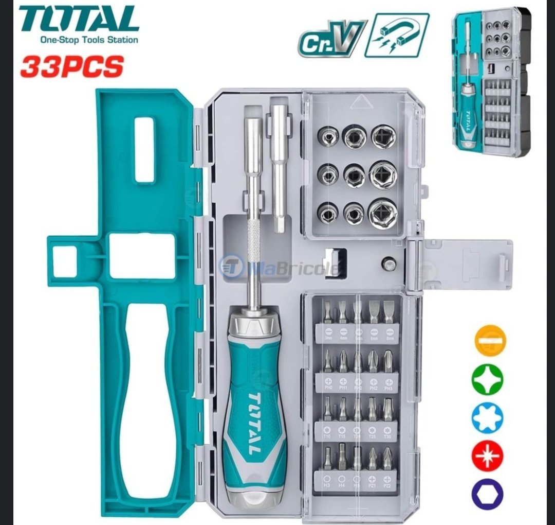 Jeu de tournevis à cliquet douilles et embouts il contient 33 pièces livrées dont son coffret de la marque TOTAL fabrique avec de l’acier chrome vanadium et la pointe du tournevis est en aimant ce pack peut être utilisée pour les réparations aussi bien dans la sphère privée que dans les ateliers et les industries pour travailler