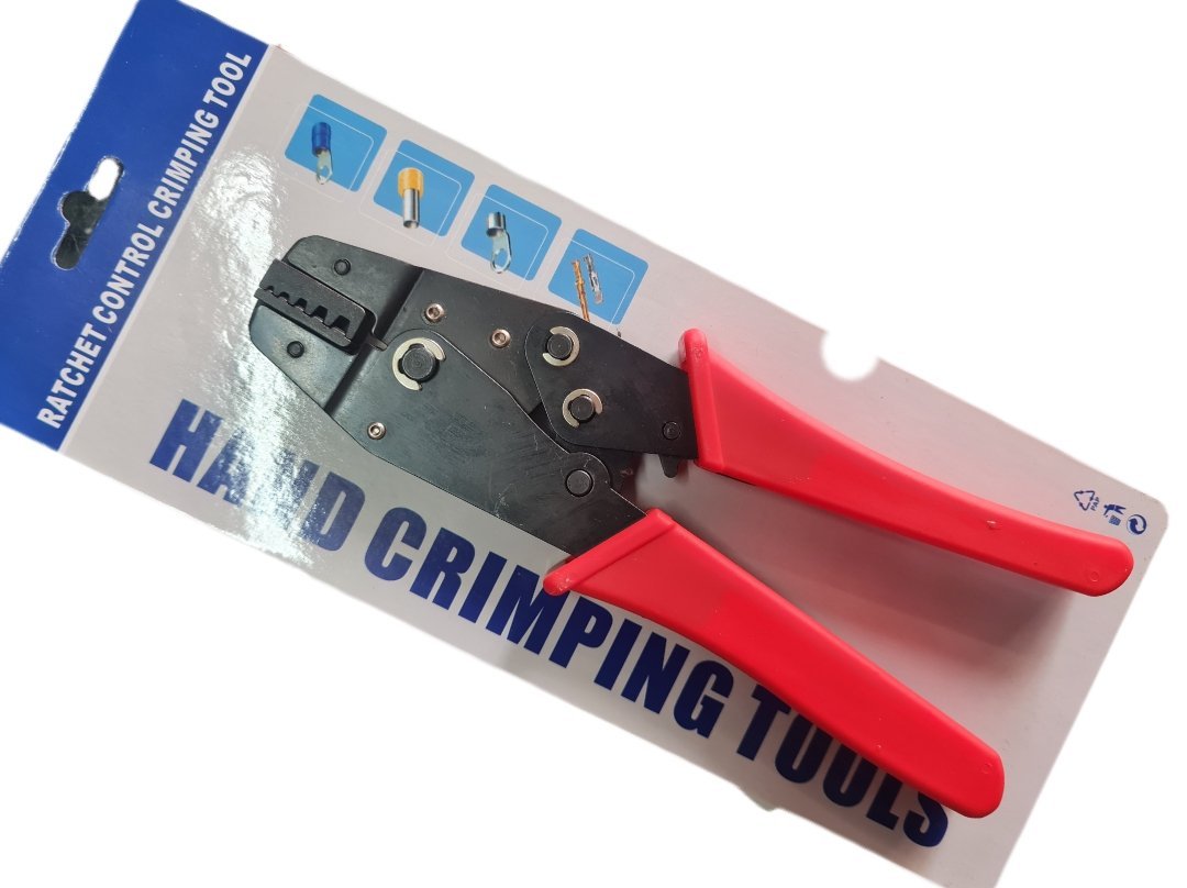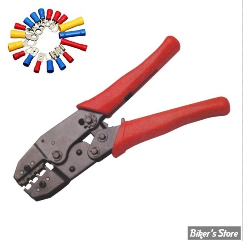 pince à sertir à cliquet (ratchet crimping tool), un outil utilisé par les électriciens et les techniciens réseau pour fixer des connecteurs aux extrémités des câbles électriques ou de données.