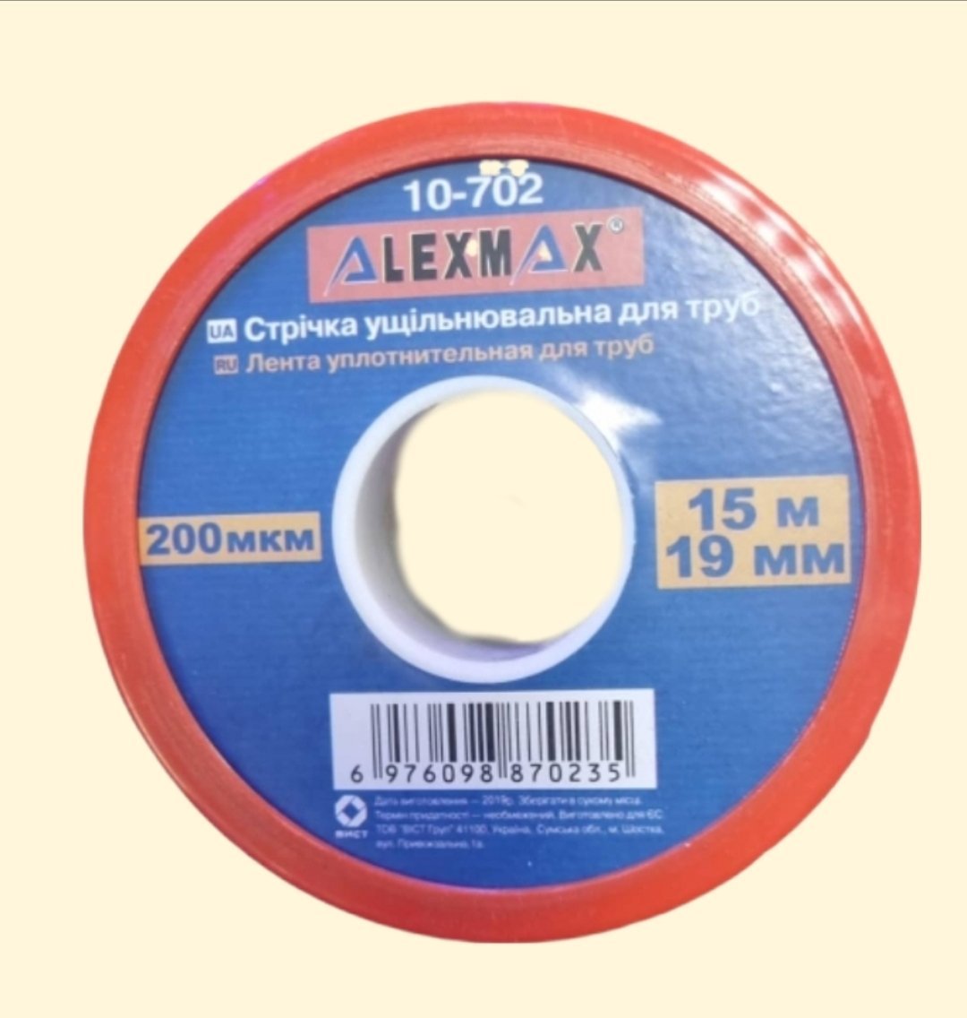 Teflon, ruban d’étanchéité pour tuyaux Alexmax (bande PTFE ou téflon), également connu sous le nom de bande FUM (ФУМ-стрічка) en ukrainien et en russe, pour les travaux de plomberie.
