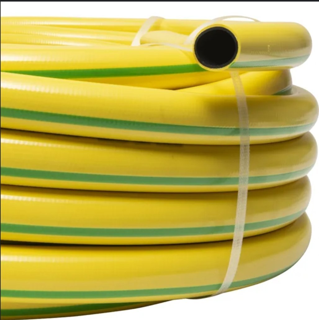 tuyau d’arrosage enroulé, probablement en polychlorure de vinyle (PVC). Ce type de tuyau est un accessoire essentiel pour le jardinage, servant à transporter l’eau vers les plantes, les pelouses ou les champs.
