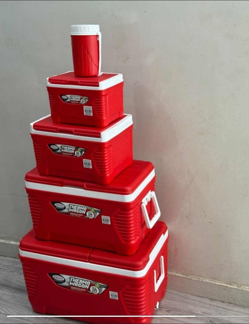 Marque : Thermo Wagon, L’ensemble comprend généralement quatre glacières de tailles différentes et un pot/carafe isotherme, le tout dans une différence couleur vif avec des accents blancs.Utilisation :